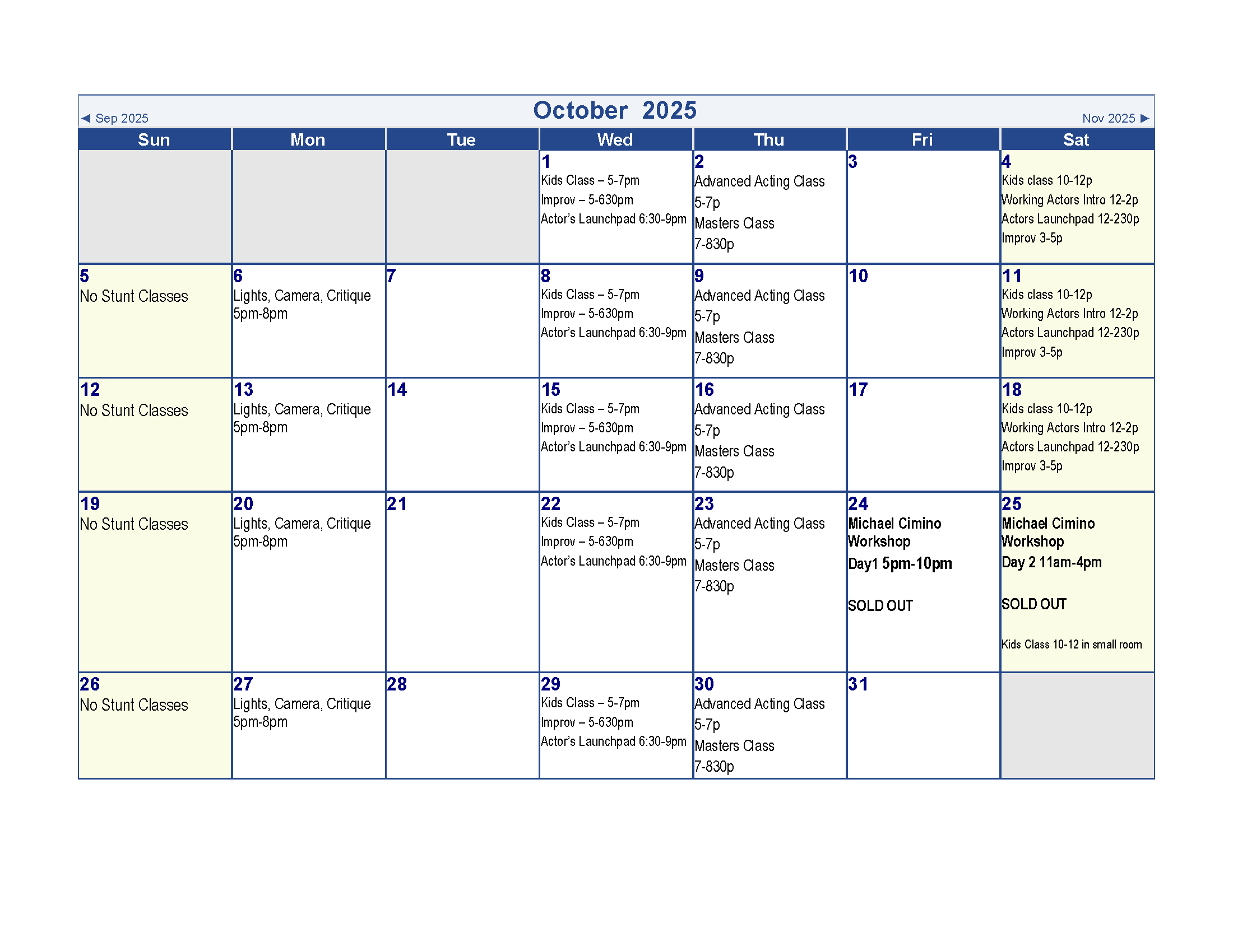 We teach the skills needed to seek a career in Film and Television Arts. This Includes Improv, On-Camera and Scene breakdown skills as well as performance critique.